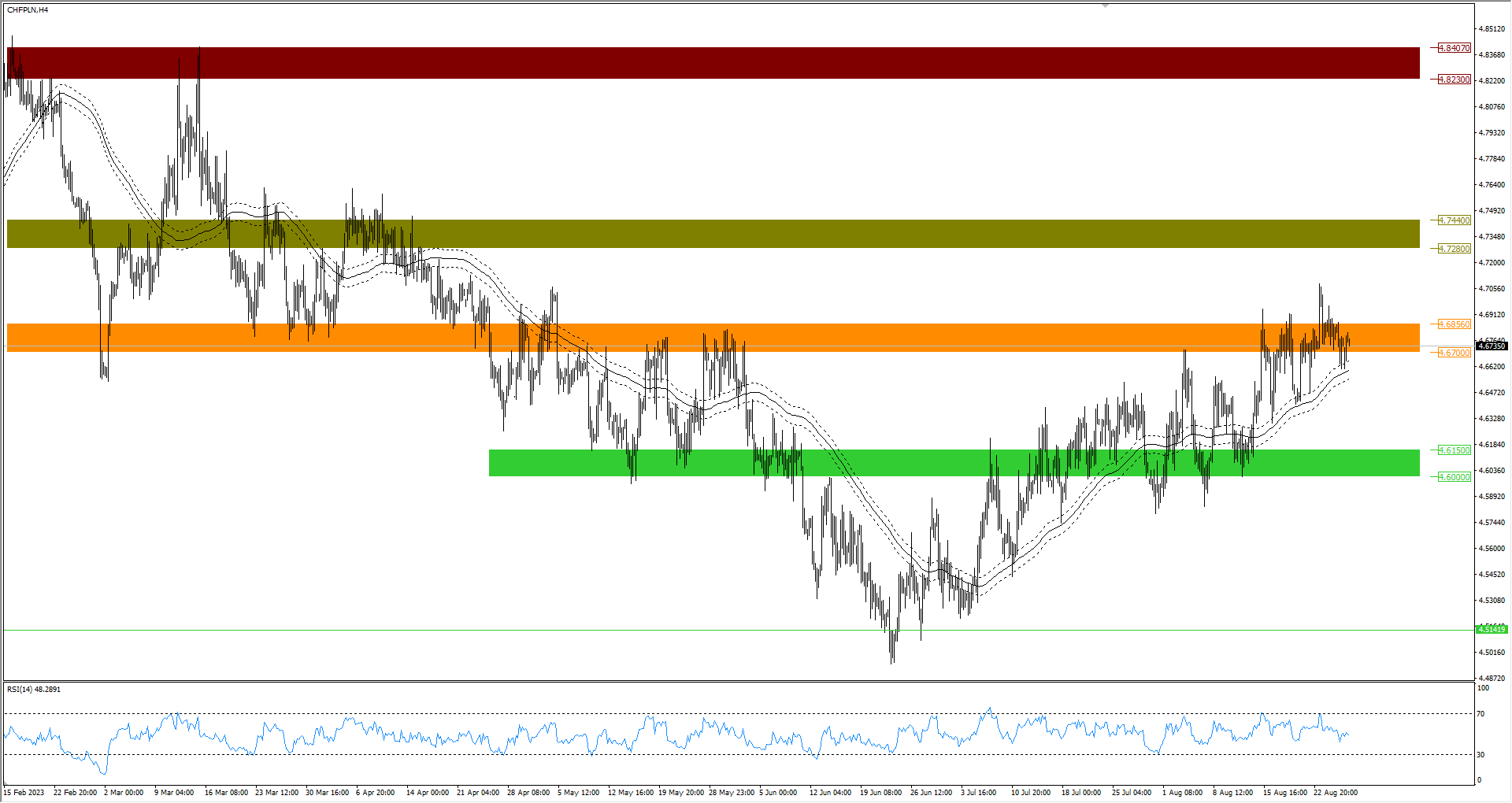 Notowania pary CHF/PLN znajdują się obecnie w zakresie cenowym 4,6700-4,6860 zł. Rynek dokładnie bada ten zakres w poszukiwaniu siły do wzrostu.