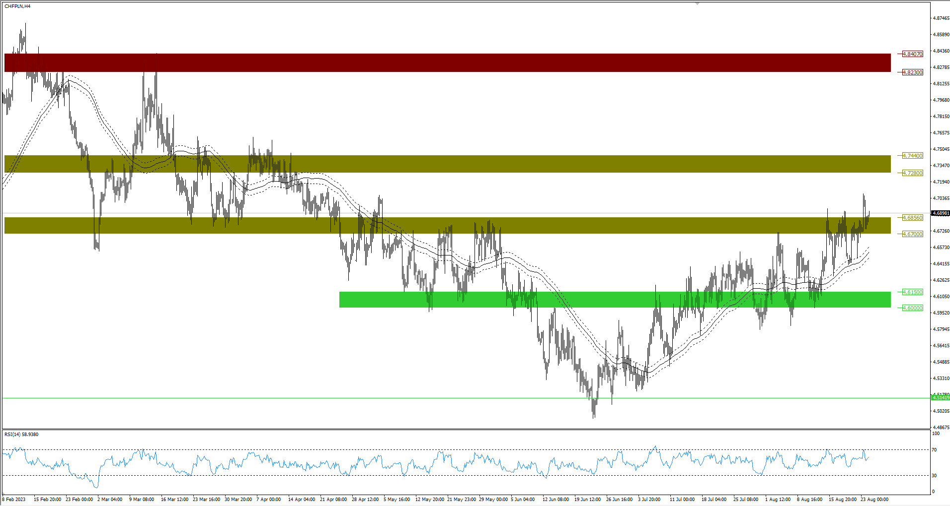 Frank wreszcie pokazał ruch, na który przyszło nam dosyć długo poczekać. Przełamanie poważnej strefy oporu 4.6700-4,6860 zł, to sytuacja, w której rynek rozpocząć może kolejną kampanie wzrostową. Podana strefa służyć będzie jako trampolina dla wzrostów.