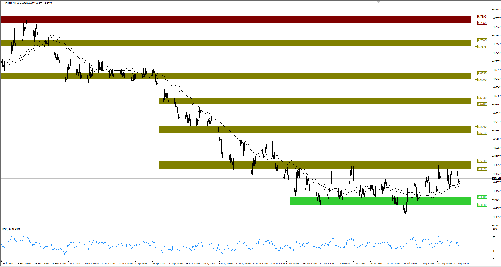 Na rynku EUR/PLN niewiele się zmienia w kontekście układu technicznego. Euro cały czas odbija się od średniej i jeżeli, dalej będzie wykazywało taką zależność, będzie mogło wykonać ruch wzrostowy.