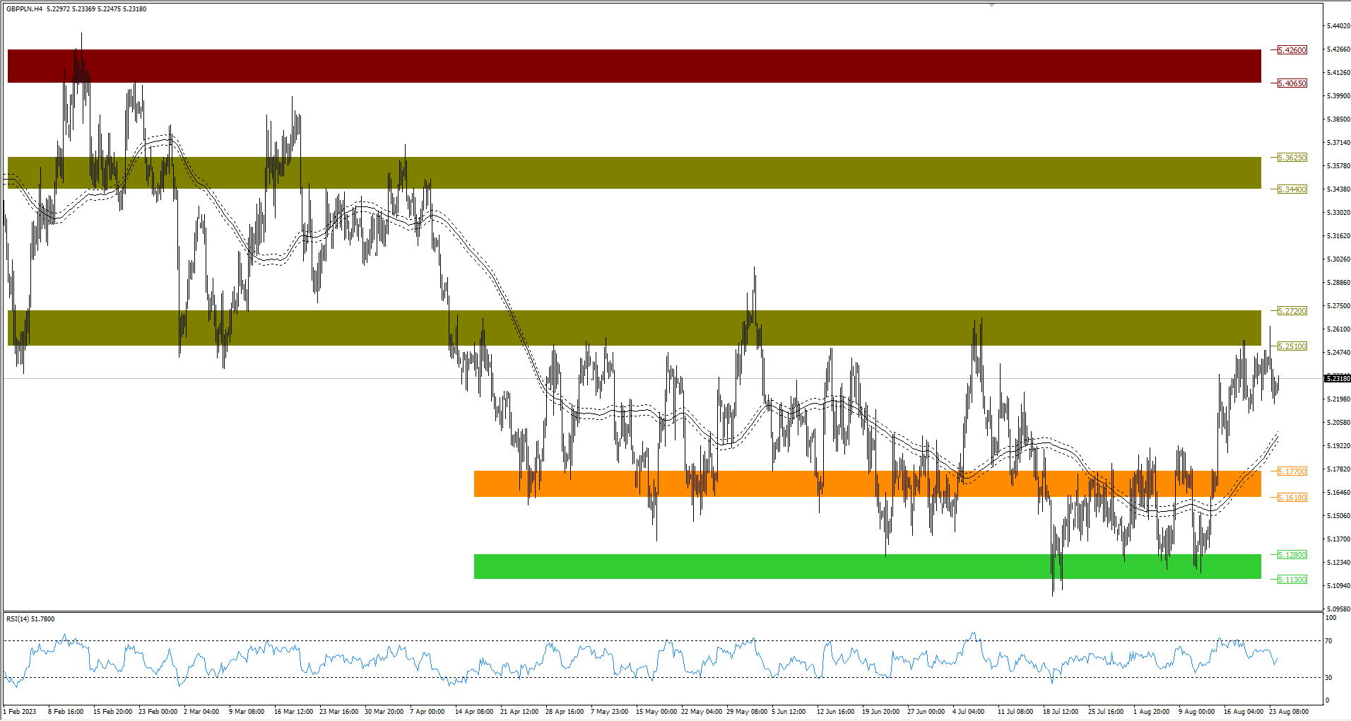 Funt szterling po raz kolejny badał zakres cenowy 5,2510-5,2720 zł i ponownie okazał na nim słabość. Patrząc na ostatnie przyspieszenie średniej, zdaje się, że funt będzie chciał na nią poczekać, aby przełamać zakres 5,2510-5,2720 zł.