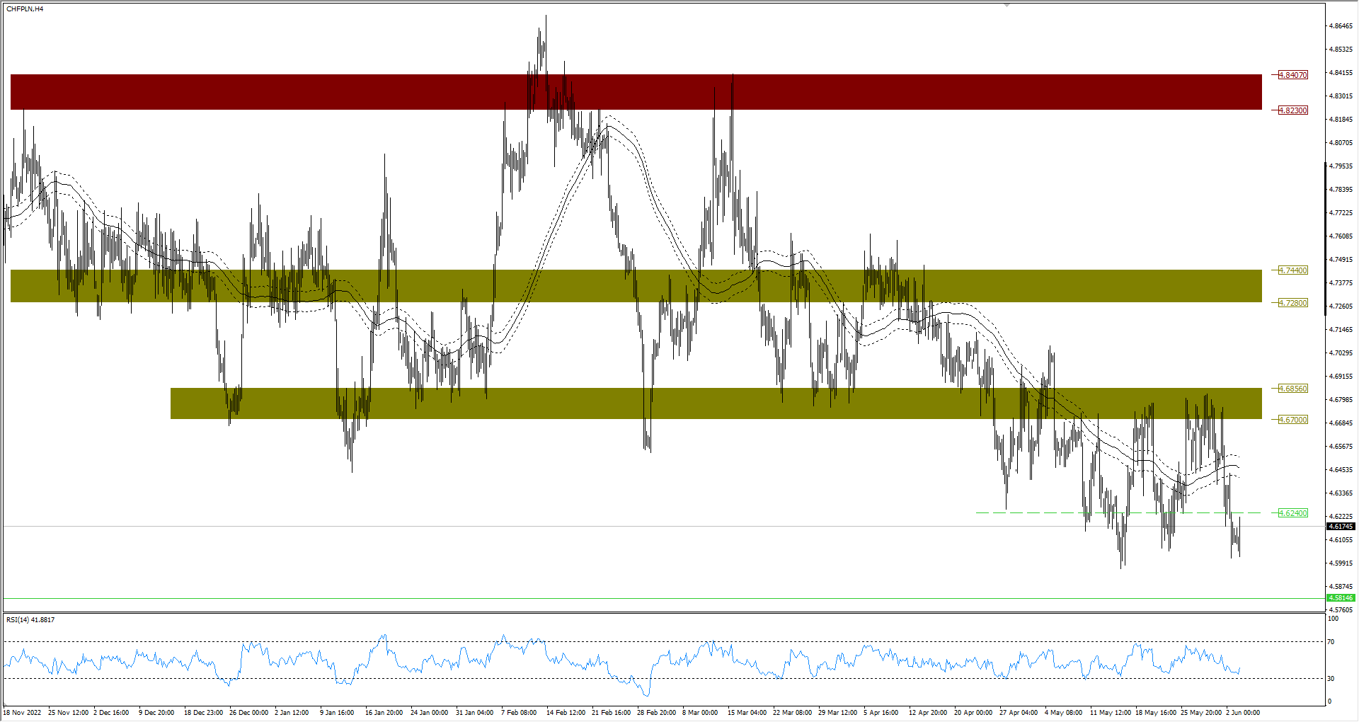 Frank szwajcarski nadal znajduje się poniżej pewnej, ważnej bariery. Mowa tu o zakresie cenowy 4,6240 PLN. Dopóki złoty pilnuje tego obszaru, frank ma jeszcze potencjał do spadku.