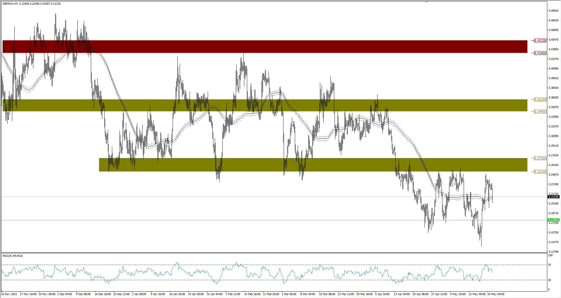 Patrząc już na wykres pary walutowej GBP/PLN, należy zauważyć, że oscyluje ona na zakresie średniej. Obie waluty będą walczy o ten obszar, a jak na razie w lepszej sytuacji znajduje się funt. Jego przewaga może zwrócić go w kierunku 5,25 PLN.