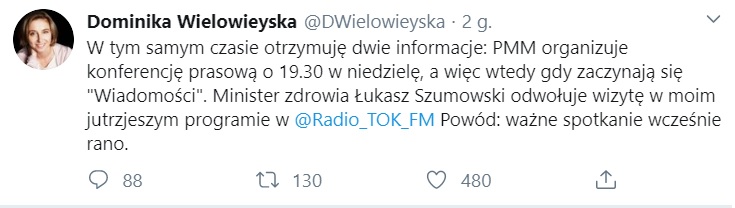Takiego tweeta opublikowała z kolei dziennikarka Dominika Wielowieyska (usunęła jednak post):
