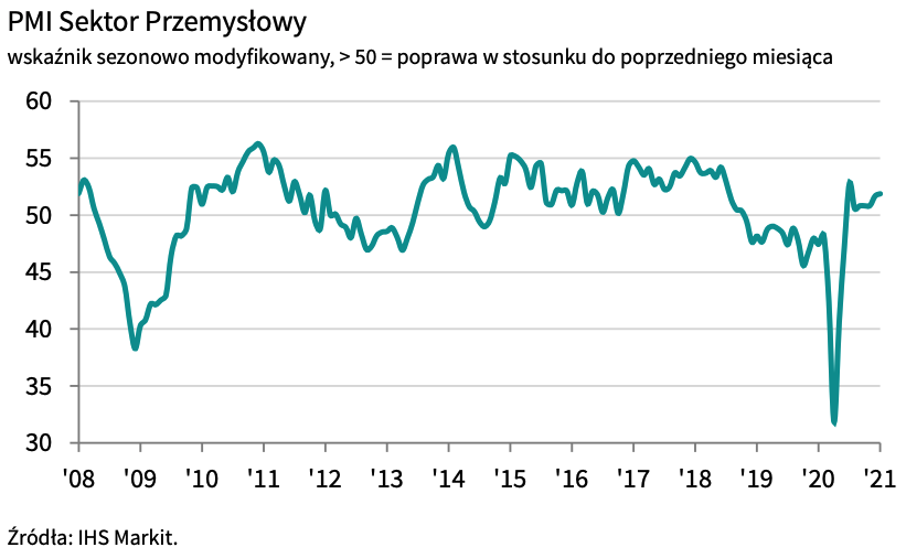 Na uwagę zasługuje fakt, iż styczeń 2021 r. był już siódmym miesiącem z rzędu, kiedy wartość wskaźnika utrzymywała się powyżej poziomu 50 pkt. (51,9), sygnalizując najsilniejszą od lipca poprawę warunków gospodarczych w polskim sektorze wytwórczym. Ponadto najnowszy odczyt PMI jest drugim najwyższym wynikiem od lipca 2018.