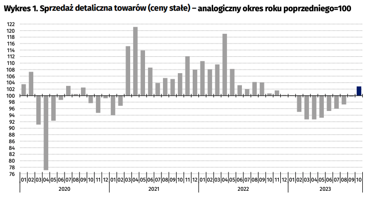 Analizując raport Głównego Urzędu Statystycznego zwrócić należy uwagę, że wzrost sprzedaży detalicznej o 4,8 proc. wyraża jej zmianę nominalną. Realnie, tj. po uwzględnieniu inflacji odnotowano bowiem jej wzrost jedynie o 2,8 proc. w stosunku do października 2022 r.