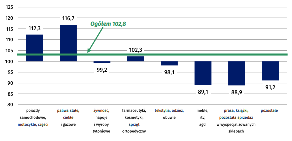 Wzrost sprzedaży zaobserwowano również w przedsiębiorstwach handlujących pojazdami samochodowymi, motocyklami, częściami (o 12,3%) oraz farmaceutykami, kosmetykami, sprzętem ortopedycznym (o 2,3%).