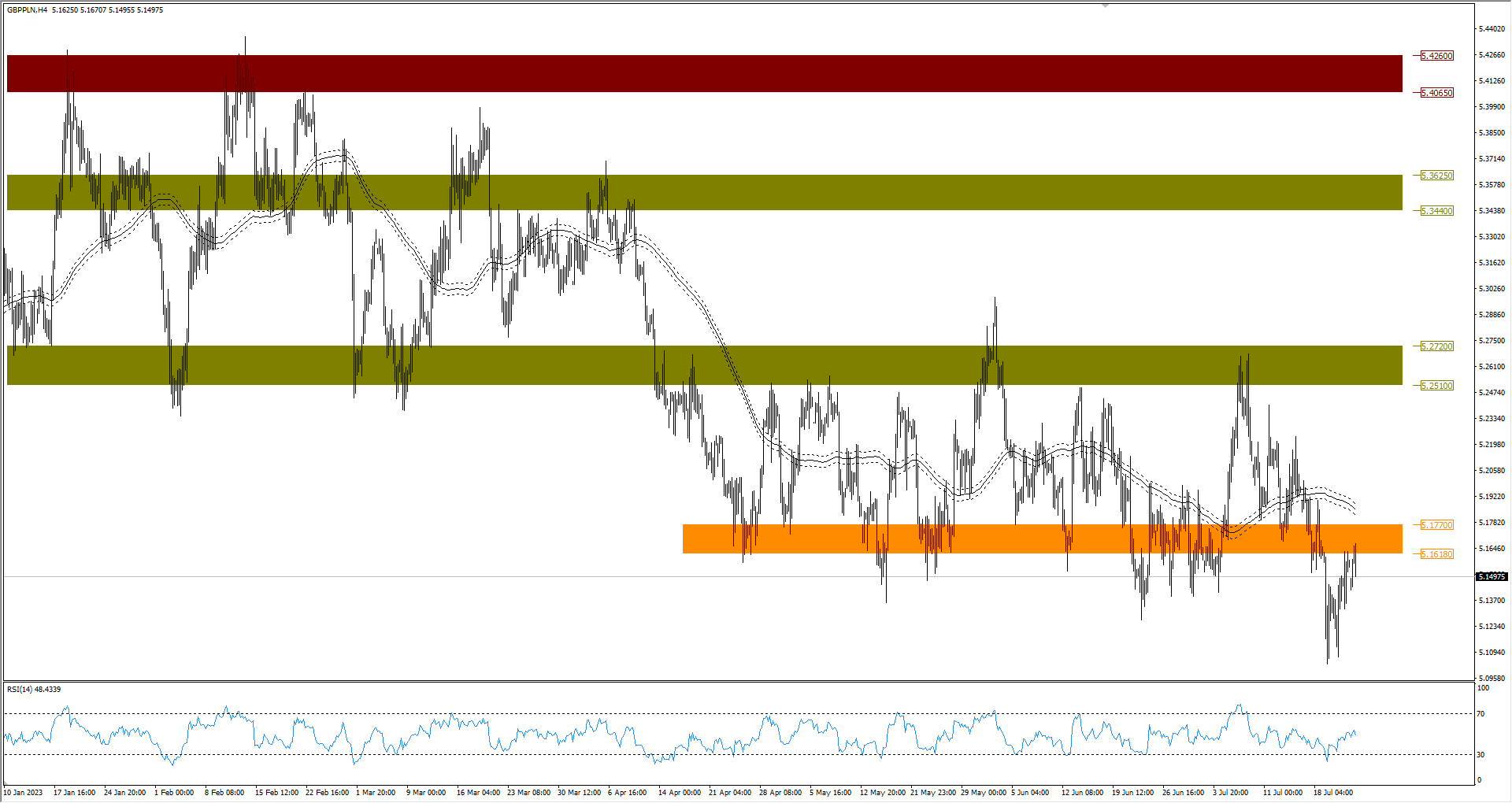 Zauważmy, że już funt i złoty walczyli dziś rano o zakres cenowy 5,1618-5,1770 zł. Funt choć wszedł do tego obszaru, szybko został z niego wyrzucony i jest utrzymywany przez złotówkę w rejonach 5,15 zł.