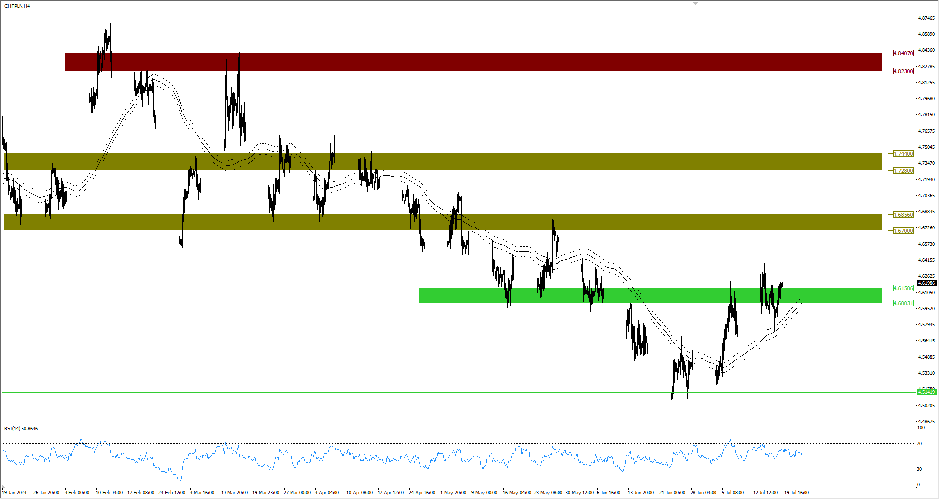 Frank szwajcarski utrzymuje się powyżej strefy 4,6000-4,6150 zł, czym uświadamia, że jest to teraz dla niego wsparcie. Frank ma szanse z tego obszaru zbierać siły, aby wyruszyć w górę.