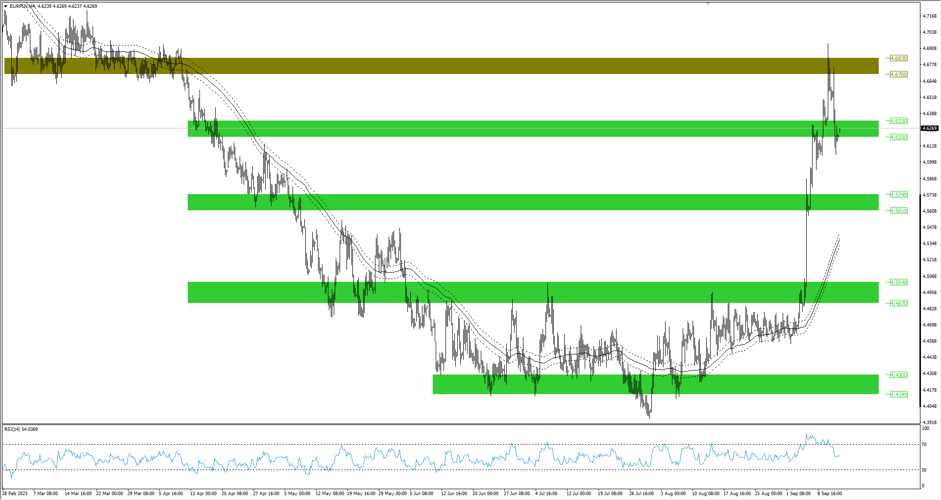 W przypadku euro obserwowane cofnięcie rozpoczęło się z zakresu cenowego 4,6700-4,6830 zł. Złotówka potwierdziła ten obszar jako „swój” i sprowadziła euro do strefy 4,6200-4,6330 zł. Teraz warto poczekać na reakcję ze strony wspólnej waluty.