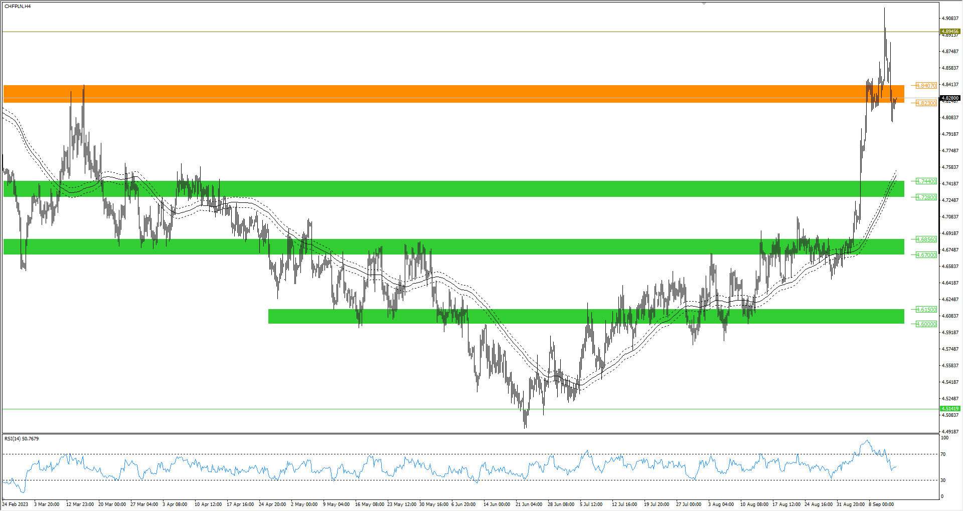 Frank szwajcarski miał cofnąć według ostatniej analizy i taki też ruch wykonał. Zakładany spadek miał spowodować wejście kursu CHF/PLN do zakresu 4,8230-4,8407 zł i na tym zakresie znajduje się obecnie frank. Jeżeli w tym obszarze złotówki pokazałaby siłę, notowania mogą cofnąć nawet do 4,80 zł.