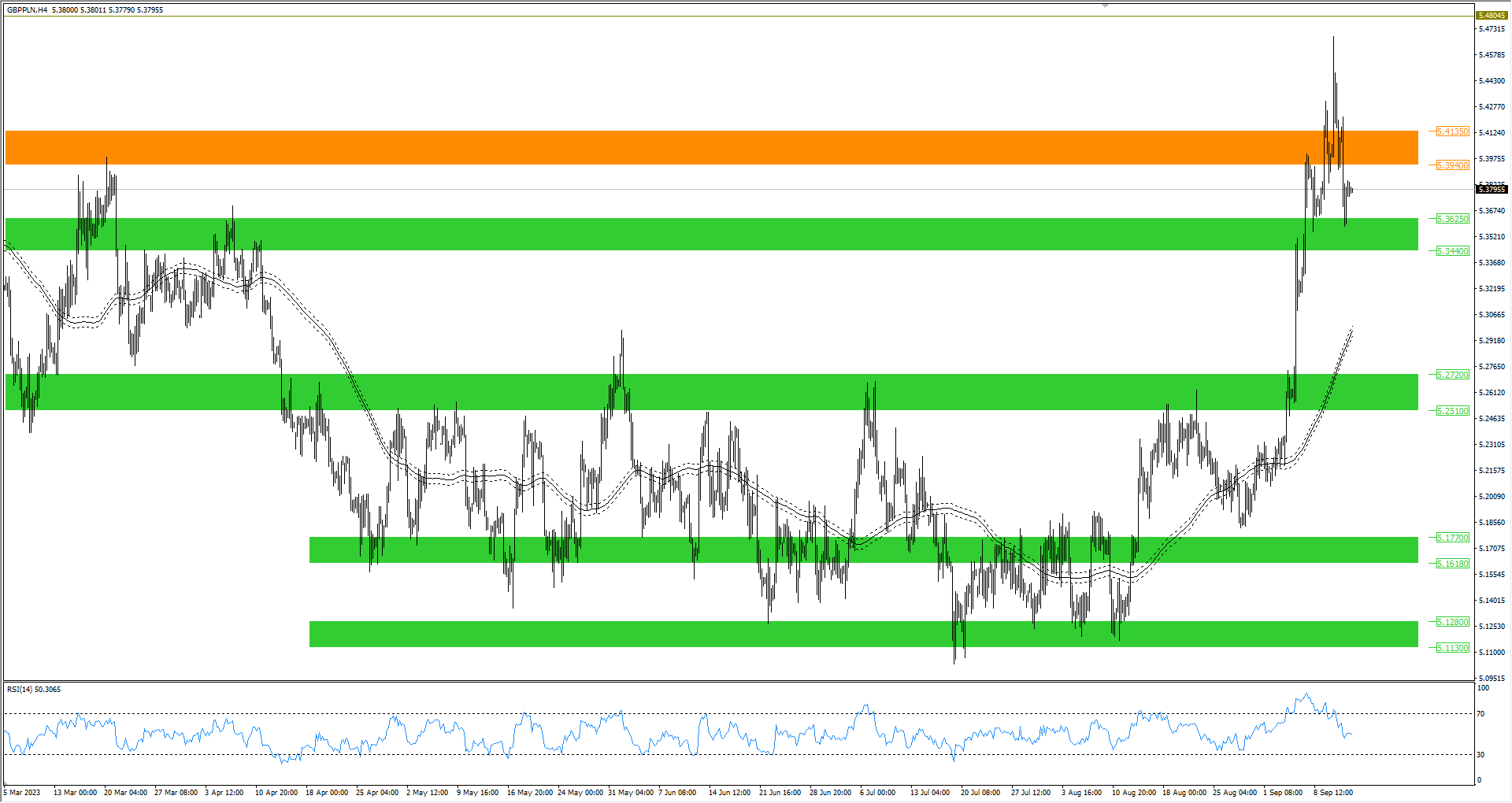 Funt szterling również zgodnie spadł i w tym ruchu dobił do zakresu 5,3440-5,3625 zł. Notowania obecnie znajdują się pomiędzy strefą 5,3440-5,3625 zł, a obszarem 5,3940-5,4135 zł. Z tego powodu warto będzie obserwować, która ze stron przejmie stery i poczekać na kurs GBP/PLN w jednej z wymienionych stref.