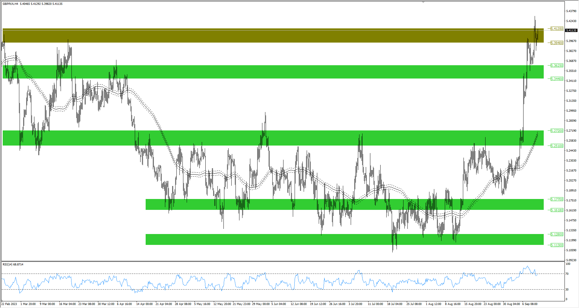 Brytyjska waluta testuje obszar cenowego oporu w postaci przedziału 5,3940-5,4135 zł. Wygrana funta na tym zakresie to otwarta droga do gigantycznego ruchu w postaci 5,48 zł. Sytuacja jest bardzo ciekawa i pytanie, czy rzeczywiście funt pokusi się o taki ruch.