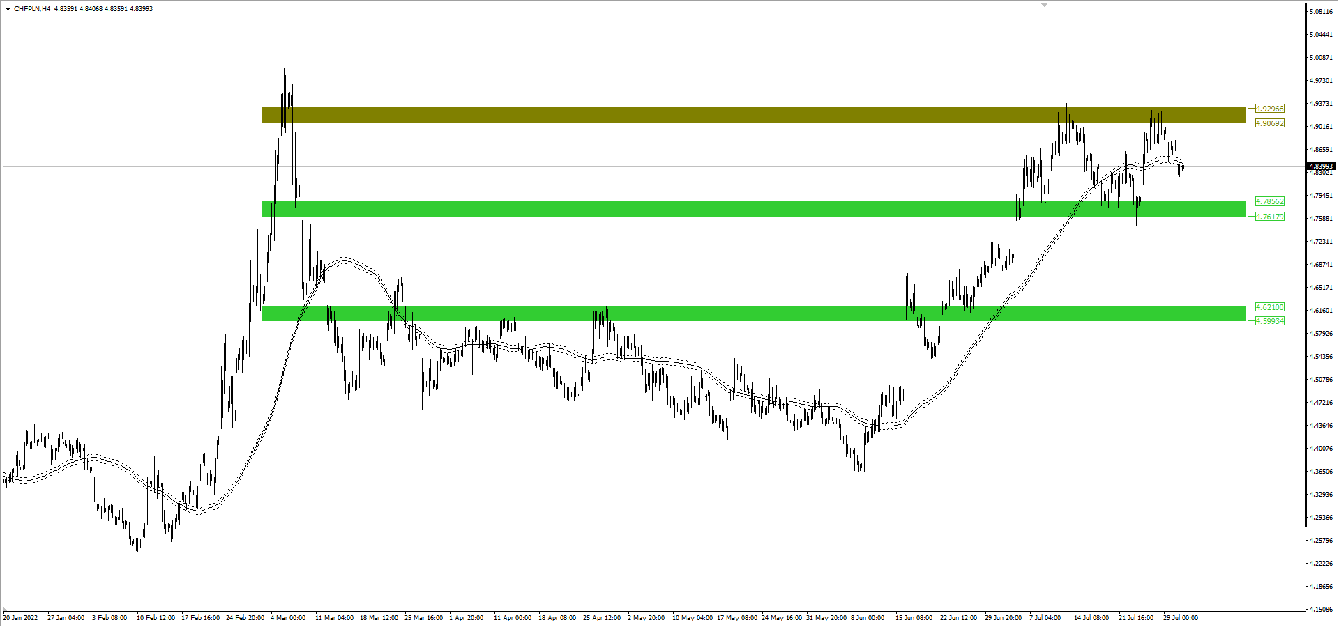 Ważne w najbliższym czasie będzie obserwowanie reakcji w strefie 4,60-4,63 PLN. Najbliższe godziny mogą pokazać, czy ten zakres rzeczywiście zostanie utrzymany. Liczyć należy się, że poniżej wspomnianej strefy (4,60-4,63 PLN) rynek ma szansę na spadek nawet do poziomu 4,50 PLN.