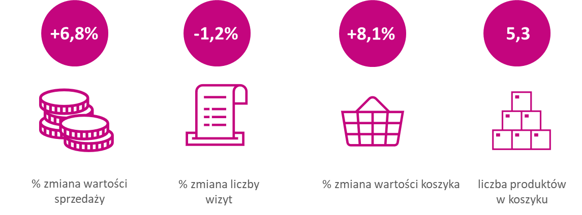 Za blisko 7% wzrostem wartości sprzedaży stały produkty świeże na wagę (mięsa, wędliny, warzywa, owoce, sery itd.), których łączna wartość sprzedaży wzrosła rok do roku o nieco ponad 28%. Ponadto wzrosła wartość sprzedaży nabiału (+6,9%) czy alkoholi mocnych typu whisky, rum, gin czy likiery (+5,0%). Spadki tradycyjnie już towarzyszyły takim używkom, jak piwo (-6,7%), wódka (-6,1%) oraz wyroby tytoniowe (-4,9%).