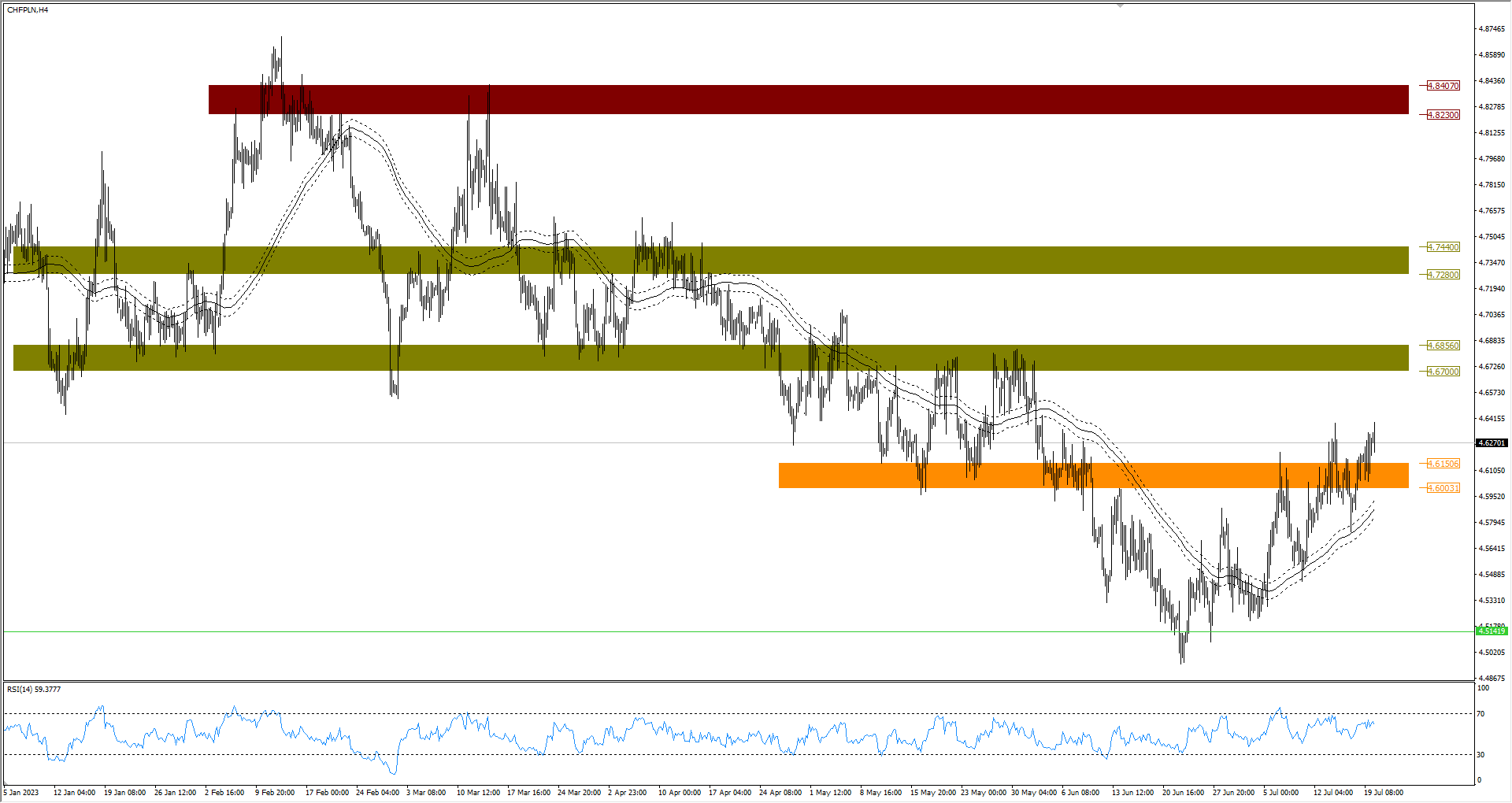 W przypadku pary CHF/PLN warto będzie obserwować, jak rynek podejdzie do walki o poziom 4,64 PLN. Dziś testował ten zakres, podobnie jak tydzień wcześniej. Ponownie znalazł podaż, która spycha kurs. Jeżeli jednak frank wygra z lokalnymi szczytami, otworzy sobie drogę do 4,6700 PLN.