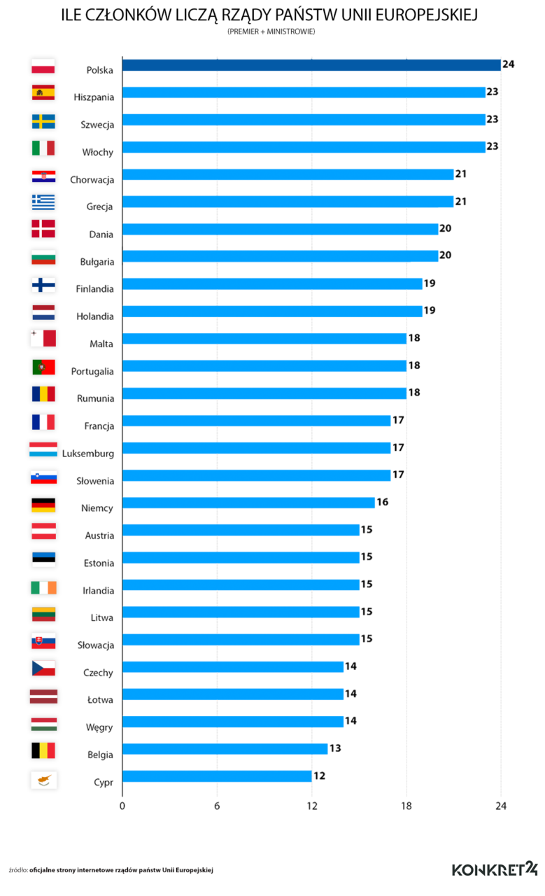 Nieco mniej, bo po 23 ministrów mają rządy w Hiszpanii, Szwecji i we Włoszech. Na szarym końcu rankingu z najmniej licznymi gabinetami plasują się natomiast rządy Belgii (13 ministrów) oraz Cypru (12 ministrów). Okazuje się więc, że Rada Ministrów Mateusza Morawieckiego jest dwukrotnie liczniejsza od rządu Cypru, który składa się z 11 ministrów i kierującego nimi prezydenta, który jest jednocześnie szefem rządu.