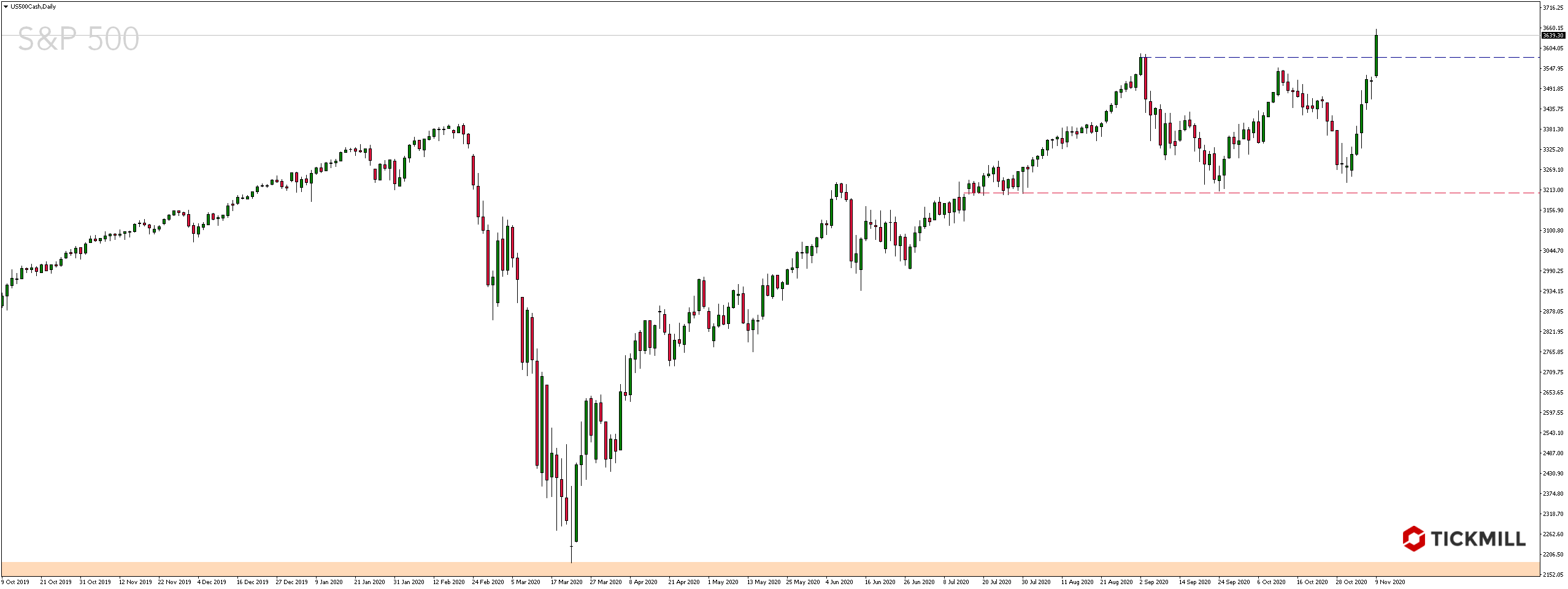 Oznacza to, że w ciągu zaledwie kilku dni, notowania indeksu S&P500 wzrosły o ponad 400 punktów. Tak znaczna aprecjacja sprawiła, że jego kurs znalazł się na najwyższym poziomie w historii.